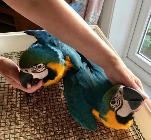 These macaws are not bonded, so they can be adopted individually or together. Each bird is hand-fed, harness-trained, and fully tamed, making them ideal for both novice and experienced parrot owners.